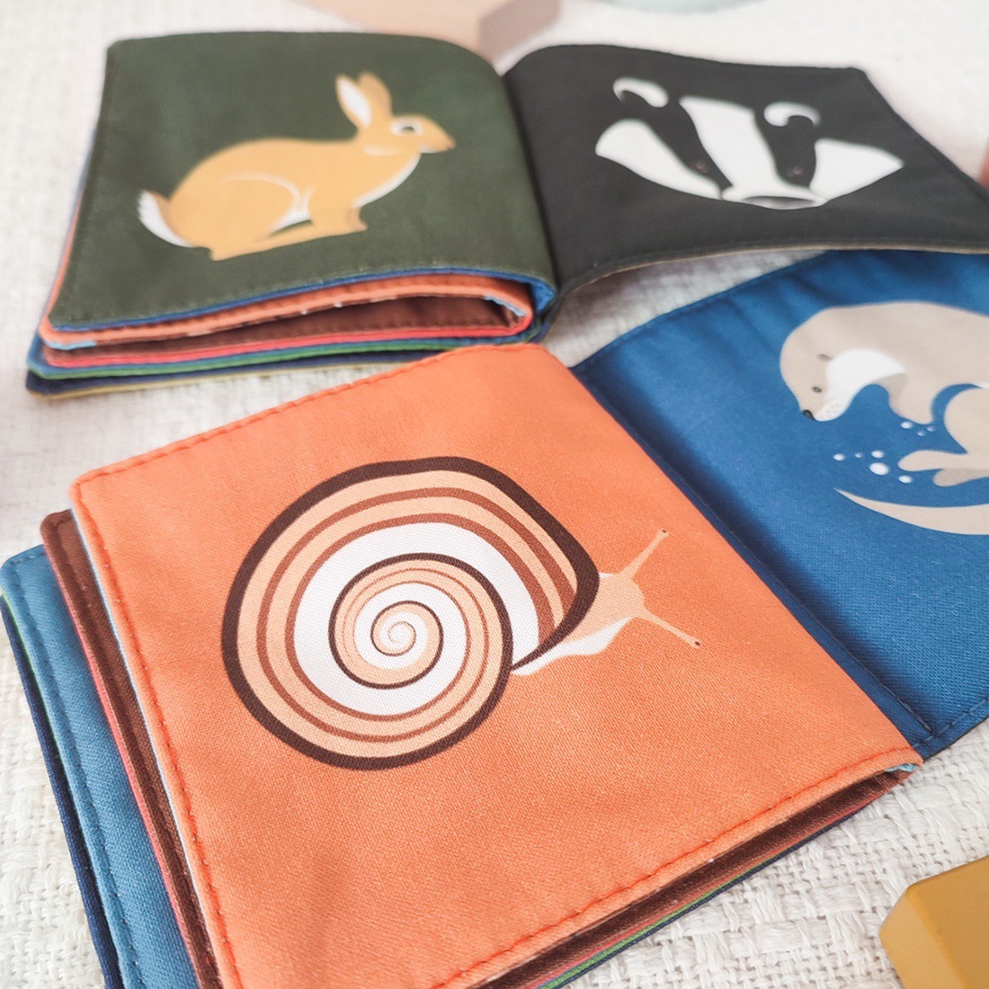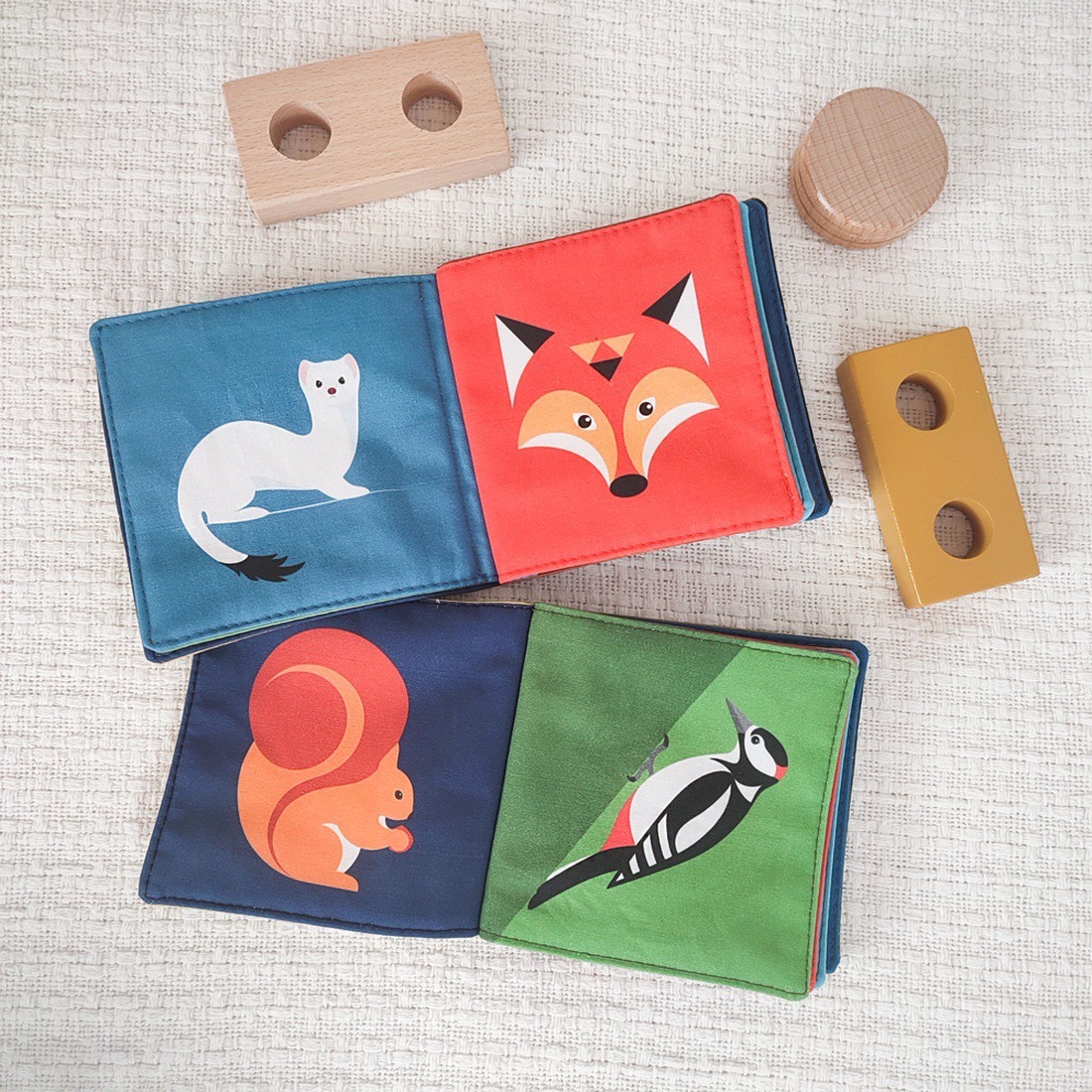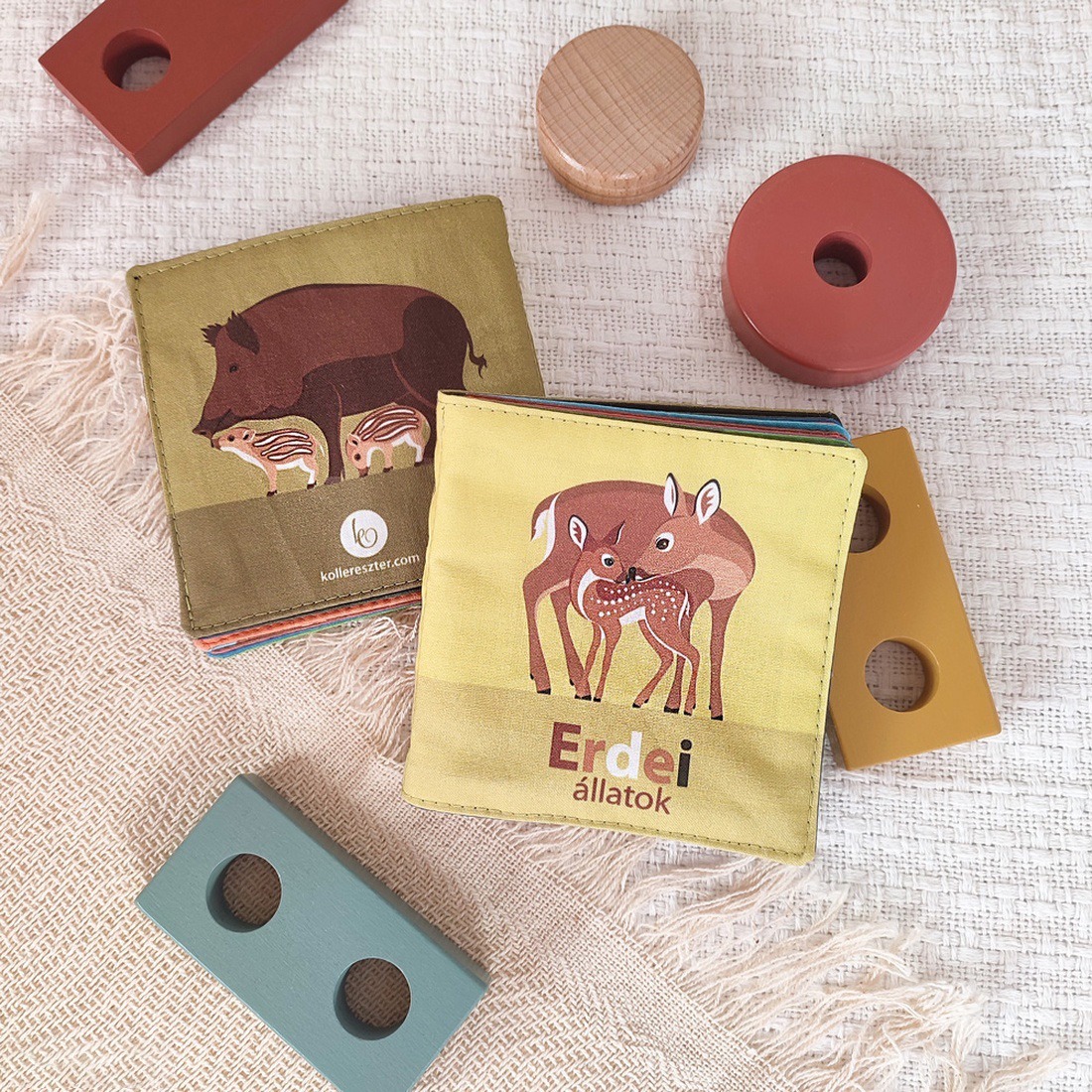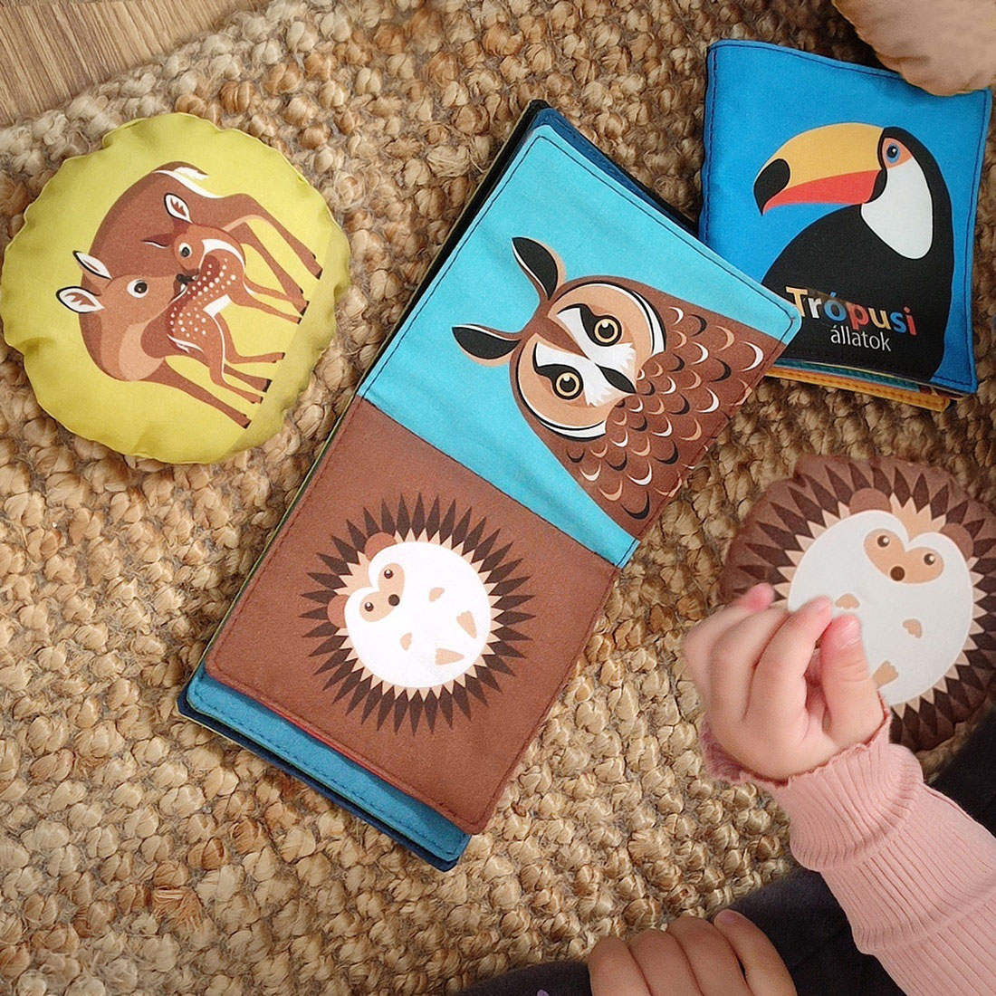 Az erdei állatos babakönyvben az őz család, a keleti sün, a pannon csiga, az erdei fülesbagoly, az európai vidra, a hermelin, a vörös róka, az üregi nyúl, a borz, a vörös mókus, nagy fakopáncs és a vaddisznó család kapott helyet.